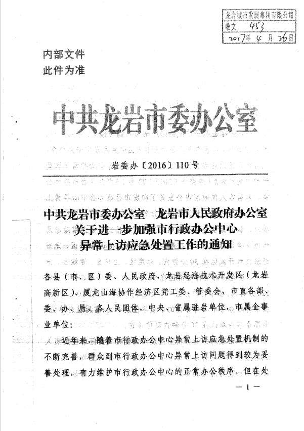 市委辦關(guān)于進一步加強市行政辦公中心異常上訪應(yīng)急處置工作的通知(巖委辦【2017】110號)