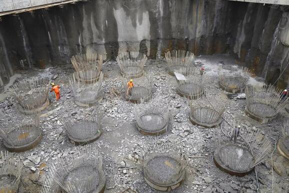 8月24日,繼龍巖大道高架橋主橋主塔樁基、承臺基坑開挖完成后,項目已進入主塔承臺施工階段,主橋封底混凝土澆筑完成0.75米(共1.5米),主橋轉(zhuǎn)體關(guān)鍵設備鑄鋼球鉸已生產(chǎn)完成現(xiàn)場正進行樁頭破除作業(yè)。由于連續(xù)橫跨贛龍鐵路、龍廈鐵路、羅龍東路、龍津河、雙洋路,主橋采用不對稱跨塔梁同時轉(zhuǎn)體施工,其轉(zhuǎn)體總重達2.366萬噸,轉(zhuǎn)體懸臂173.75m,施工難度巨大。為避免對城市道路及鐵路運行的影響,主橋?qū)⒉捎貌粚ΨQ跨塔梁施工并分二次轉(zhuǎn)體,下一步進行控制性工程為兩次主塔轉(zhuǎn)體施工。