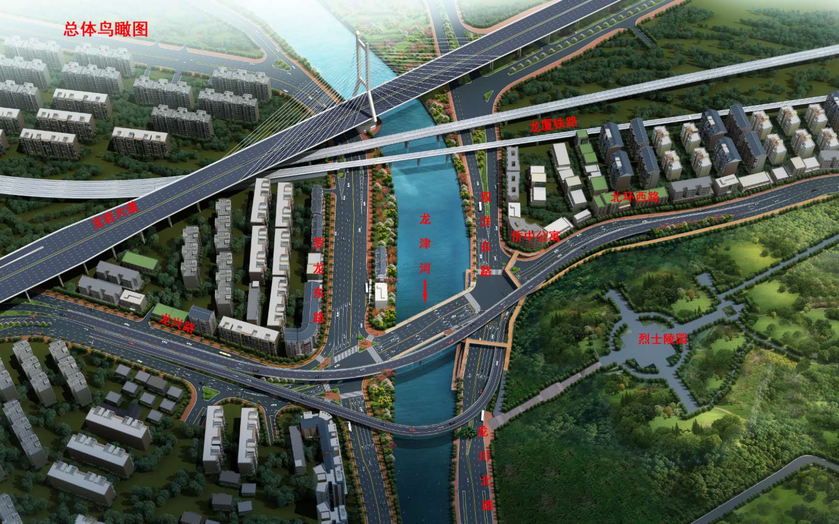 沿北環(huán)西路、龍興路設置南北分離式雙向四車道高架,南側接龍興路,北側接現(xiàn)狀北環(huán)西路,高架靠東側布置(緊貼烈士陵園),橋梁總長約1140米,凈寬約7.7米;在雙洋路、龍川北路、北環(huán)西路設置人行天橋,與山體步道銜接,以完善慢行系統(tǒng);在烈士陵園山體下采用明挖回填方式設置框涵,長度約225米,凈寬10.75米。